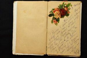 | n@m_0254 Λεύκωμα Μαρίας Πατρικίου 1903 | Χωρίς εξώφυλλο. Τίτλος, Λεύκωμα Μαρίας Ε. Πατρίκου Εν Αρτάκη τη 1 Ιανουαρίου 1903. 165*100, φ. 8, διακόσμηση με χάρτινες φιγούρες. |