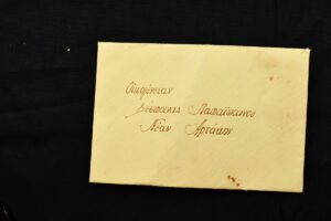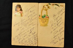 | n@m_0183 Λεύκωμα Μαρίας Πατρικίου 1907-1910 (β) | Λεύκωμα σε σημειωματάριο δερματόδετο λευκό με διακόσμηση καρδερίνες σε κλαδί. Φθαρμένο εξώφυλλο 12 φύλλα, διακόσμηση με χάρτινες φιγούρες ρωσσικές με κυριλική γραφή. 100*164mm. Μηχανικές φθορές και υγρασία. ΑΝΑΓΚΗ ΣΥΝΤΗΡΗΣΗΣ |