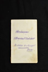 | n@m_0183 Λεύκωμα Μαρίας Πατρικίου 1907-1910 (γ) | Λεύκωμα σε σημειωματάριο δερματόδετο λευκό με διακόσμηση καρδερίνες σε κλαδί. Φθαρμένο εξώφυλλο 12 φύλλα, διακόσμηση με χάρτινες φιγούρες ρωσσικές με κυριλική γραφή. 100*164mm. Μηχανικές φθορές και υγρασία. ΑΝΑΓΚΗ ΣΥΝΤΗΡΗΣΗΣ |