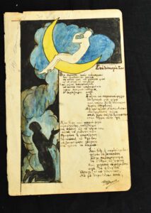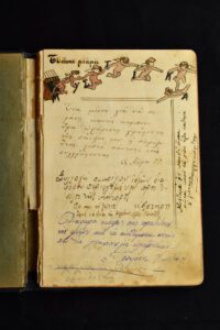 | n@m_0255 Λεύκωμα Μικρά Μυστικά Αγλαϊας Χατζημιχάλη 1930 (β) | Σημειωματάριο αγράμμωτο με σκληρό εξώφυλλο. Στο εξώφυλλο "Poesie". 71 φ. 192*127 τα φύλλα, 130*200@16mm εξώφυλλο. Σχέδια Τάκης Θηβαίος, πενάκι και ακουαρέλα |