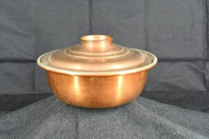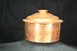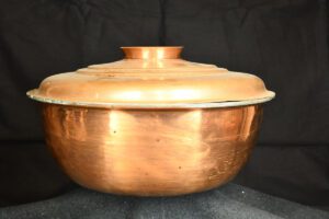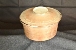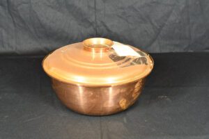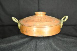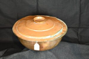| n@m_0033 Πλακί Μπακιρένιο με Καπάκι (μικρό) | Σκεύος χάλκινο επικασιτερωμένο. Με καπάκι. Φ.147-22mm Υ 73 σώμα. Καπάκι Φ208 - 60, Υ38. Σύνολο Υ 115. |