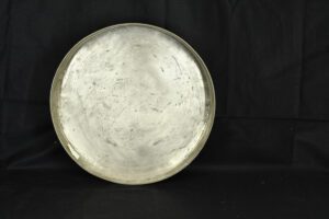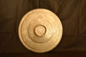 | n@m_0032 Πλακί Μπακιρένιο με Καπάκι (μεσαίο) | Σκεύος χάλκινο χωρίς λαβές. Επικασιτερωμένο με καπάκι. Εγχάραγκτη διακόσμηση, ομόκεντροι κύκλοι. Φ 278-17 Υ98 σώμα. Καπάκι: Φ 272-71 Υ 144mm συνολικά. |