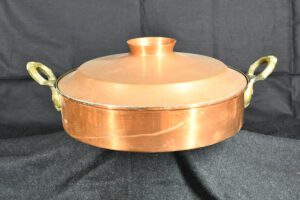 | n@m_0173 Κατσαρόλα Χάλκινη με Καπάκι | Χάλκινη κατσαρόλα επικασιτερωμένη με χάλκινο καπάκι. 230-355. Υ 125 στο σώμα. Φ348-85 καπάκι. Υ 186 συνολικό 79 καπάκι. |
