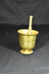 | n@m_0035 Γουδί με Γουδοχέρι | Ορειχάλκινο. Φ 71-115mm. Υ116. γουδοχέρι Υ190 Φ35-21. |