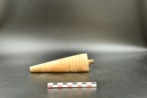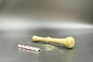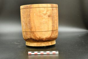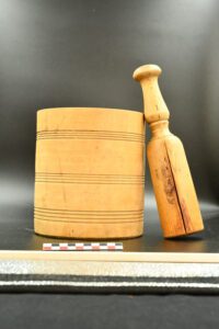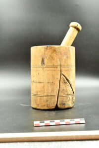 | n@m_0113 Γουδί Ξύλινο (α) | Ξύλινο γουδί με ξύλινο στέλεχος ίσως από γουδοχέρι. Σκίσιμο από την βάση ως το χείλος. Υ162 Φ130-155. Εγχάρακτοι ομόκεντροι κύκλοι για διακόσμηση. Χέρι κωνικό μέρος, Υ 173 Φ 47. Γουδί Υ162, Φ157-129. |