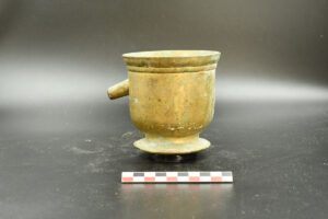| n@m_0202 Γουδί Μπρούτζινο | Γουδί σκυφοειδές με λαβή. Ορειχάλκινο με οξείδωση. Φ 103-85*104Υ. 188*38 χέρι. |