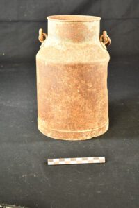| n@m_0399 Καρδάρα Γάλακτος Μεταλλική | Δοχείο μεταφοράς γάλακτος με λαβή χωρίς καπάκι. Λευκοσίδηρος. Οξεοδωμένη εκτενώς. Διασώζεται το στέλεχος για το κλείσιμο του καπακιού. Υ230* Φ153 |